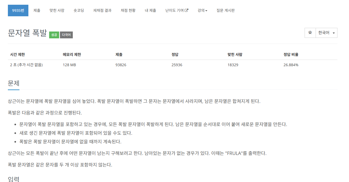 - 문자열 str과 폭발 문자열 bomb을 입력받는다.