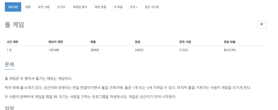 - N개의 돌이 있을 때, 누가 이기는지를 출력하는 문제입니다.