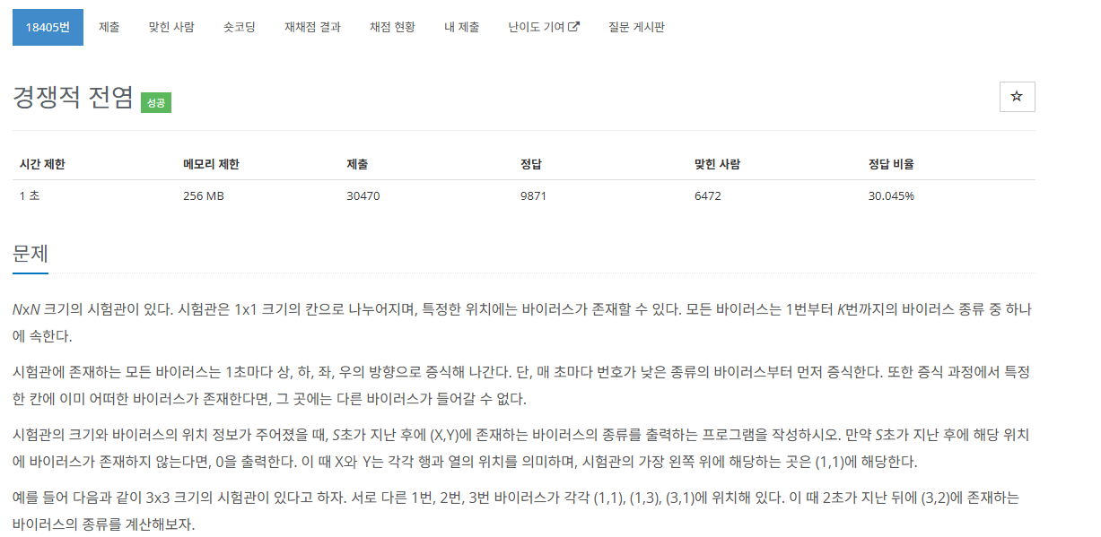 우선순위 큐에는 바이러스 번호들을 기준으로 작은 순서대로 정렬을 하였고 특정 위치들을 우선순위 큐에 넣어서 관리했다.(새로 생성된 바이러스 포함)
