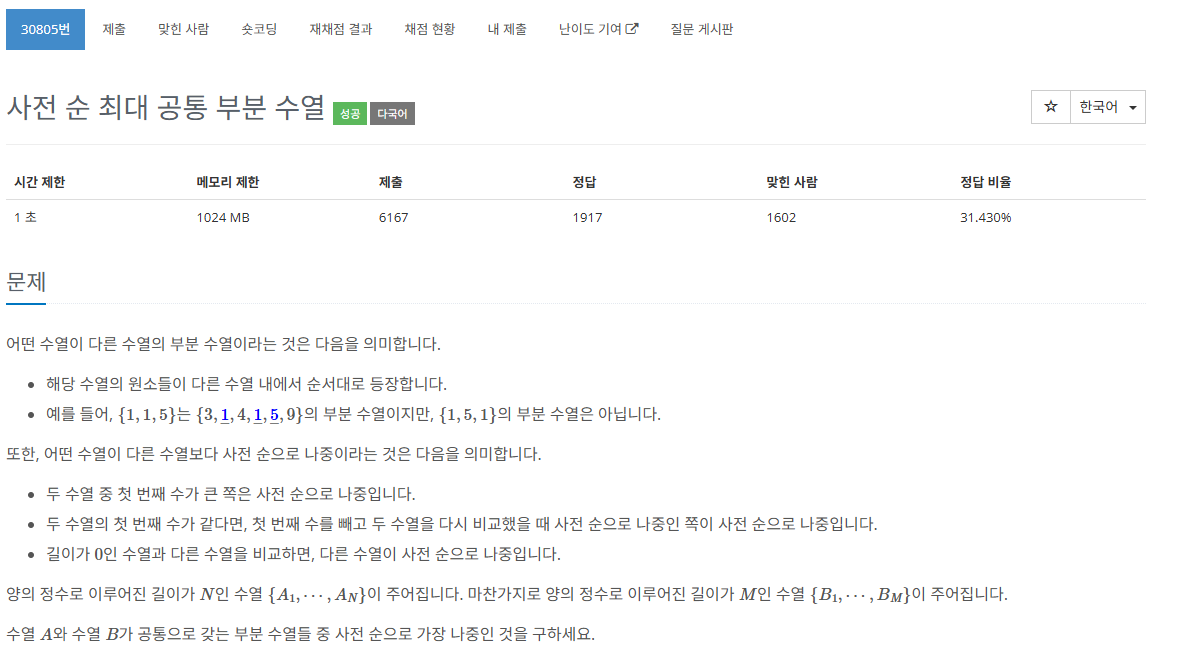 두번째 문제 해당 부분은 수열이다. 공통 부분 수열은 인덱스 순서를 중요시 한다.
