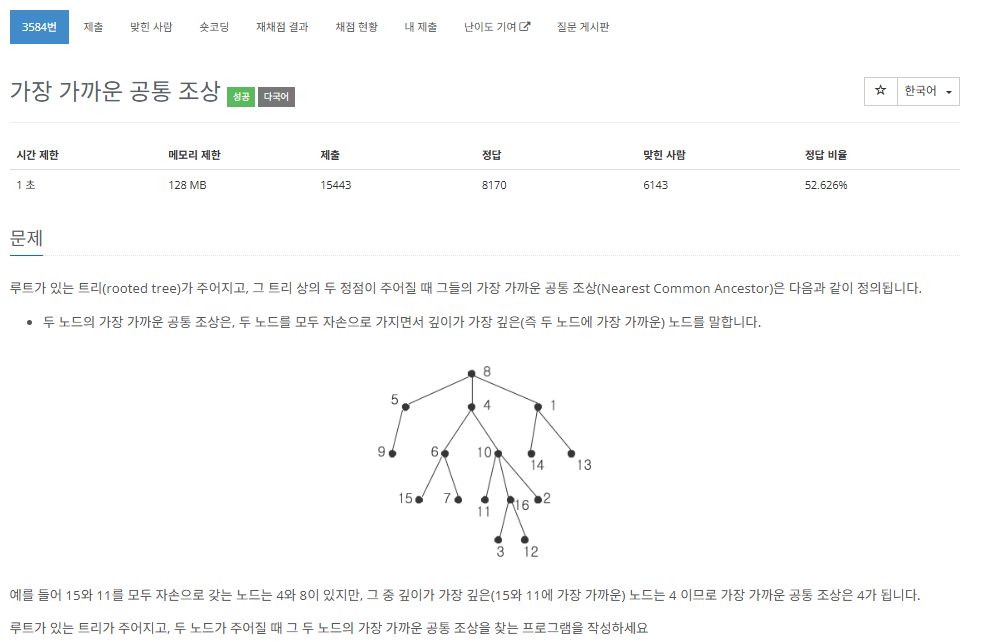 그 이후의 2가지 값이 들어오면 최소 공통 조상을 찾는 과정은 쉽다.