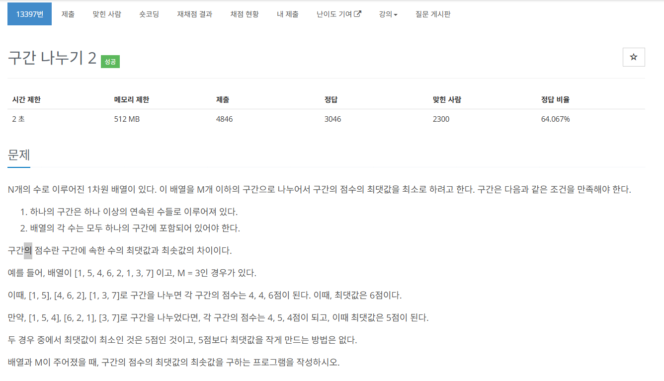 입력된 배열을 M개 이하의 구간으로 나눌 때, 각 구간의 점수(최대값 - 최소값)의 최댓값을 최소화하는 값을 구하는 메인 제어 함수이다.