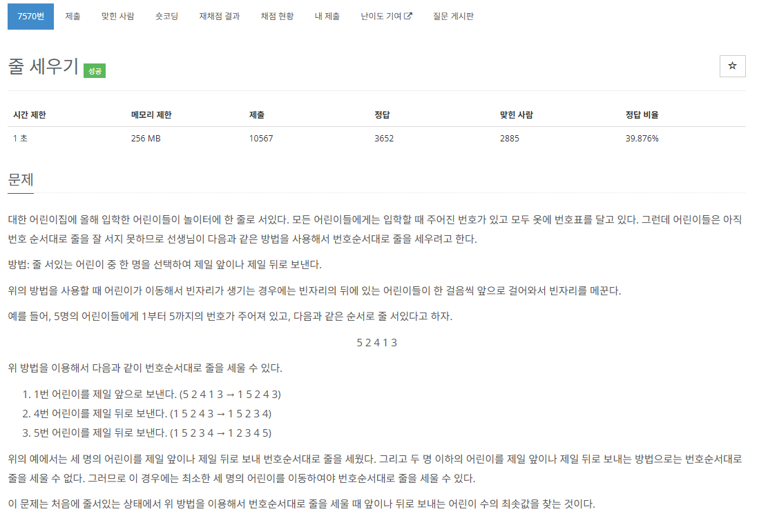 이 문제는 **“제일 앞이나 제일 뒤로만 이동시켜 번호 순서대로 정렬하는 최소 횟수”**를 구하는 문제입니다.